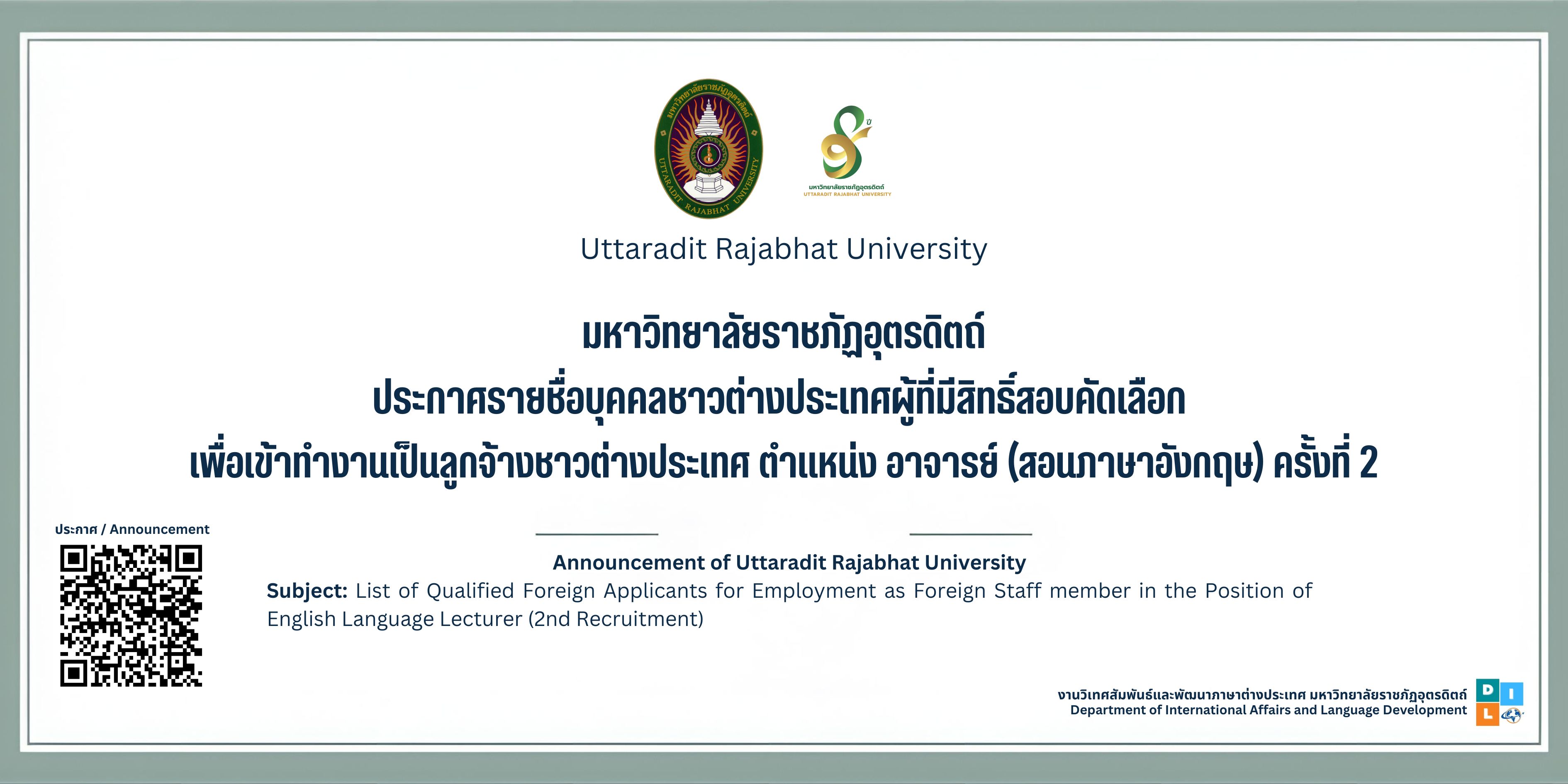 ประกาศมหาวิทยาลัยราชภัฏอุตรดิตถ์เรื่อง ประกาศรายชื่อบุคคลชาวต่างประเทศผู้ที่มีสิทธิ์สอบคัดเลือก เพื่อเข้าทำงานเป็นลูกจ้างชาวต่างประเทศ ตำแหน่ง อาจารย์ (สอนภาษาอังกฤษ) ครั้งที่ 2Announcement of Uttaradit Rajabhat UniversitySubject: List of Qualified Foreign Applicantsfor Employment as Foreign Staff member in the Position of English Language Lecturer (2nd Recruitment)